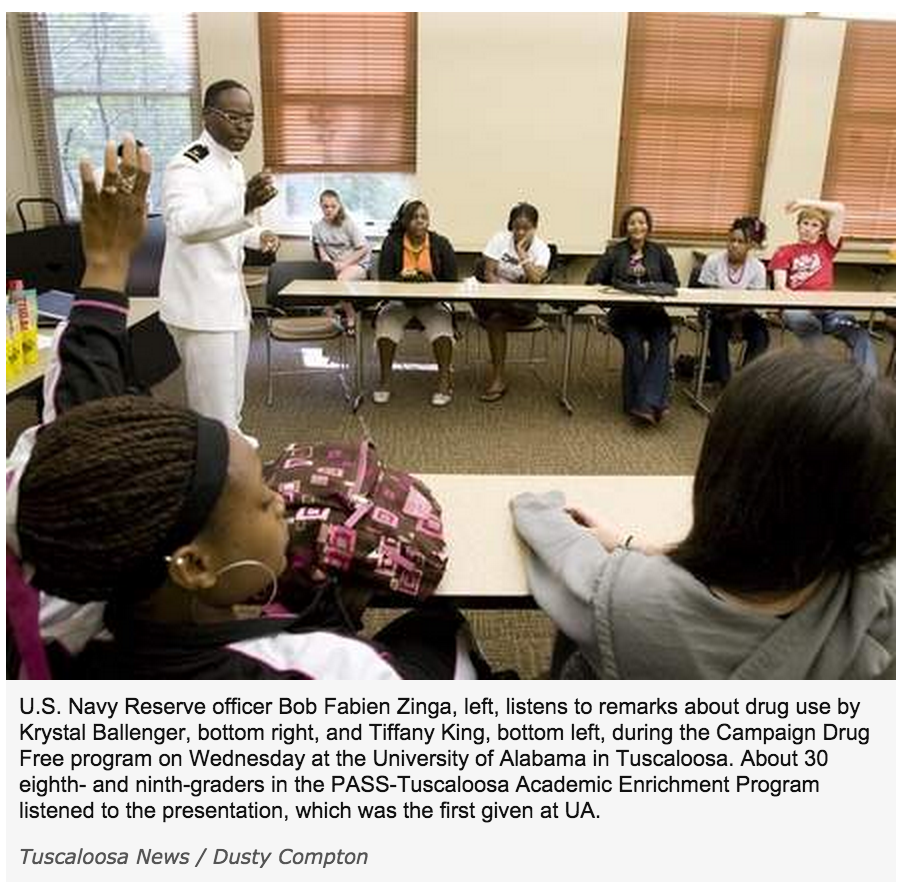 A little more than a year ago, Zinga and two other reservists started Tuscaloosa’s Campaign Drug Free, a free program by the U.S. Navy Reserve to teach elementary, middle and high school students how to say ‘no’ to drugs. Since then, the reservists have given several presentations to schools around Tuscaloosa.